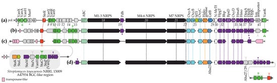 The organization of the NPDC053474, YIM 121038, XD-27, and AN091965 BGCs resembled that of the pekiskomycin BGC (pek) from Streptomyces sp. WAC1420 [64] (Figure 2a,b). In contrast, the NPDC014880 BGC was extensively rearranged and enriched with transposase-like genes, giving it a unique structure (Figure 2c).