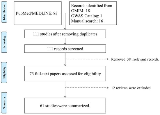 The literature search yielded 111 records. Among them, 73 relevant reports were selected for full-text review. The resulting 61 reports were summarized (Figure 1).