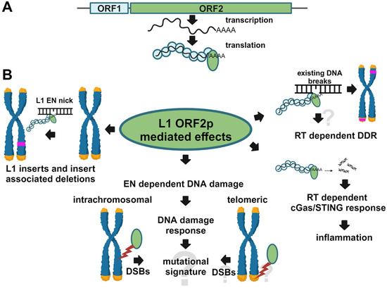 - Morrish, T.A.; Gilbert, N.; Myers, J.S.; Vincent, B.J.; Stamato, T.D.; Taccioli, G.E.; Batzer, M.A.; Moran, J.V. DNA repair mediated by endonuclease-independent LINE-1 retrotransposition. Nat. Genet. 2002, 31, 159–165. [Google Scholar] [CrossRef] [PubMed]