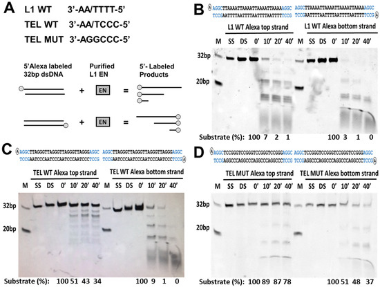 3.4. L1 Endonuclease Cuts Telomeric Sequences In Vitro