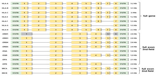 Outline of targeted PCR regions in seventeen HLA loci. Yellow boxes indicate amplified exons. Gray boxes indicate non-amplified exons. Green boxes indicate upstream UTR or 5′ untranslated region and downstream UTR or 3′ untranslated region. The region between exons involves introns.