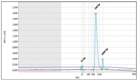 The analysis pertained to the distribution of fragments (light blue line) that underwent shearing, as observed in the entirety of the library being studied. The uppermost section of the graph depicts the fragment size evaluated (bp). In addition to the peaks, the detected baseline (in red) and the threshold for peak detection above the baseline (in blue) are displayed in the electropherogram.