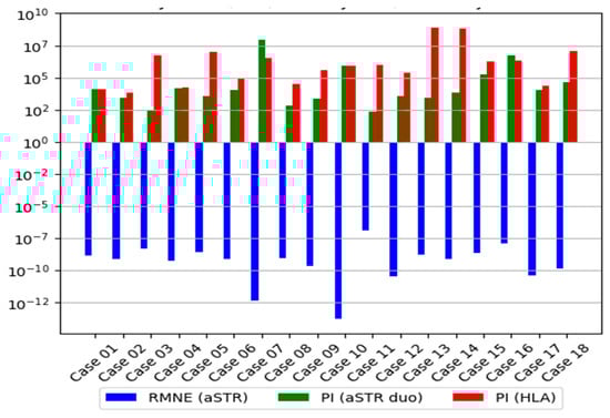 In 15 out of the 18 cases, the aSTR analysis of the results showed the alleged father (AF) could be determined as being the biological father with a probability value that ranged from 47,478 to Log10PI 3.98 × 109. Only in three cases, the probability (W) was lower than 0.9999. Particularly, in the 11th case, the total PI value (8473) represented a likelihood that the genetic data supported the hypothesis of parentage over the hypothesis of coincidental paternal obligate allele(s) (POAs) sharing (when the PI value is between 1000 and 10,000, the verbal equivalent is “strong support”). Additionally, in the 8th and 14th cases, which were motherless, the PI values 697 and 7035, respectively, were weak data to support the hypothesis of parentage and more genetic markers are required for confident paternity results. Accordingly, in all cases, the indicators combined PE, which depends on deducing, in each case, the POAs from the child (in a duo) or the child plus its mother (in a trio), ranged from 0.99999978 to 0.99999999, and the RMNE, which ranged from Log10RMNE 1.82 × 10−14 to 1.29 × 10−7 (reliable equations to determine the power of a genetic test to exclude a pair of individuals as parents), argued in favor of relatedness (Table 2).
