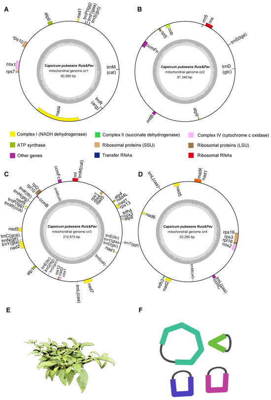 The mitochondrial genome of C. pubescens, revealed through the assembly process, exhibits a more complex structure compared to the typical singular circular genomes found in common plants. Similar to other peppers, such as C. annuum var glabriusculum [37], it consists of four multiple circular structures. The total size of the mitochondrial genome was 454,275 bp, with each of the four circles measuring 60,995 bp, 87,340 bp, 212,675 bp, and 93,265 bp, respectively (Figure 1A–D). The overall GC content was 44.28%, with the GC contents of the four circles being 44.87%, 44.22%, 44.65%, and 43.11%, respectively (Table S1). A total of 60 unique genes were detected in the C. pubescens mitogenome, including 39 PCGs, 18 tRNA genes, and three rRNA genes. The PCGs comprise only a negligible portion of the genome, totaling 33,807 bp. Among the PCGs, the nucleotide composition was A: 26.4%, C: 21.0%, G: 21.0%, and T: 31.6%, resulting in an overall GC content of 42.0%. All PCGs were found to have a single copy, except for the cox1 gene, which had two copies. Additionally, 10 genes (nad7, nad1, nad4, ccmFC, rpl2, rps10, rps3, nad2, nad5, and cox2) contained one or more introns. In terms of RNA, there were three rRNA genes (rrn5, rns, and rnl) with a single copy, and six tRNA genes (trnM-CAT, trnY-GTA, trnE-TTC, trnL-CAA, trnP-TGG, and trnD-GTC) with two or four copies, with trnM-CAT having four copies (Table 1 and Table S9). Compared with C. annuum L., there are a total of 35 protein-coding genes in C. pubescens, with differences observed in ribosomal proteins (SSUs). C. pubescens possesses unique rps1 and rps7 genes [38].