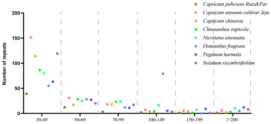 Dispersed repeat sequences are thought to have significant implications in the mitochondrial genome. These long repetitive sequences have also proven valuable as markers for exploring plant evolution, comparative genomics, and phylogenetics. The total number of repeats varied between 58 bp in C. pubescens and 218 bp in C. annuum (Figure 5 and Table 2). In most species, the majority of repeats ranged from 30 to 49 bp in length. However, in O. fragrans, they predominantly fell within the range of 100 to 149 bp. Except for O. fragrans, the smallest number of repeats ranged from 150 to 199 bp in length. Among the species, there were 22 large repeats (>1 kb), ranging from 1074 bp in S. sisymbriifolium to 17,243 bp in C. annuum, including one for C. pubescens, five for C. annuum, two for C. chinense, three for N. attenuata, seven for P. harmala, and four for S. sisymbriifolium. Our investigation revealed the presence of dispersed repeats across eight angiosperm mt genomes. However, these repeats exhibited poor conservation across species, even within the same genus. It is worth noting that the Capsicum genus exhibited significant variation in this aspect. In particular, C. pubescens showed notable differences, such as a lower number of repeat sequences, with lengths ranging from 30 to 49, and 70 to 99 base pairs compared to other Capsicum species. Moreover, the overall quantity of dispersed repeat sequences in C. pubescens followed this trend. This may be attributed to differences in their mitochondrial genome structure. While both C. chinense and C. pubescens have multiple circular structures, other species featured single-circle structures. This also indicated that C. pubescens exhibited greater variation, similar to the results of the phylogenetic analysis below.