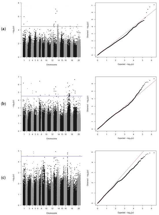 - Turner, S.D. qqman: An R package for visualizing GWAS results using Q-Q and manhattan plots. JOSS 2018, 3, 731. [Google Scholar] [CrossRef]