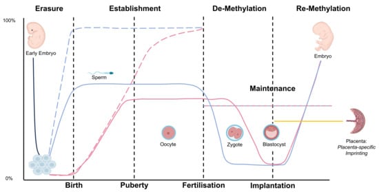 The imprinting cycle of life (based on data from mice, but with similarities in humans). In primordial germ cells (PGCs) in the embryo, DNA methylation is generally erased (solid black line). In the following, de novo methylation signals are established during gametogenesis. Here, a sex-dependent dichotomy can be observed: in the oocytes, general DNA methylation is established after birth (solid red line), whereas in sperm, it occurs soon after demethylation in the embryo and is finished at birth (solid blue line). Establishment of genomically imprinted DMRs can be observed at the same time (dashed lines) but demethylation does not affect imprinted DMRs. Imprinted loci maintain their methylation, whereas non-imprinted loci are rapidly demethylated, either actively in the case of paternal genomes or passively following DNA replication in the case of maternal genomes. It should be noted that the imprinting signature is different for several genes in the placenta and the embryo. (Pictograms have been taken from BioRender.com (accessed on 23 January 2024)).