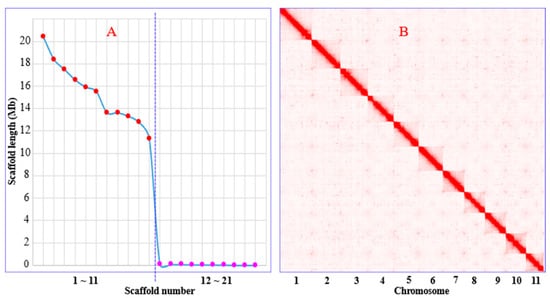Assembly information of the W. pigra genome. (A) Scaffold length distribution (the red dots indicate the 11 long scaffolds; the pink dots indicate the remaining short scaffolds); (B) Hi-C links among pseudo-chromosomes (darker red color indicates higher contact probability).