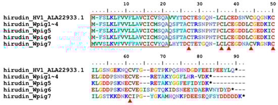 Sequence alignment of hirudins. The archetypal hirudin was from Hirudo medicinalis, while the seven hirudins were identified from the W. pigra genome. The four hirudins, hirudin_Wpig1~hirudin_Wpig4, were identical. The red frame indicates a signal peptide region; the red triangles show conserved cysteine residues; the black stars mean stop codons.
