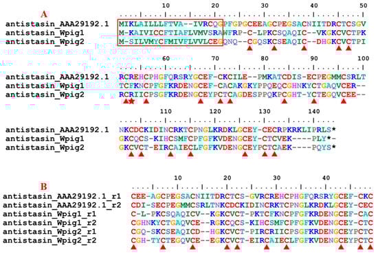 Sequence alignment of antistasins. (A) Alignment of the antistasin first discovered in Haementeria officinalis and the antistasins identified from the W. pigra genome; (B) Alignment of the internal tandem repeats of the two W. pigra antistasins. The red frame indicates a signal peptide region; the red triangles show conserved cysteine residues; the black stars mean stop codons; the red star shows the catalytic residue arginine.