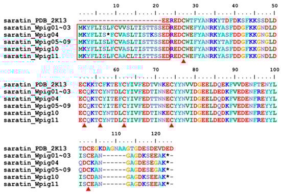 Sequence alignment of the saratins. Alignment of the archetypal saratin discovered from H. officinalis and the 11 saratins identified from the W. pigra genome. The three proteins saratin_Wpig01~saratin_Wpig03 were identical; the five proteins saratin_Wpig05~saratin_Wpig09 were identical. The red frame indicates a signal peptide region; the red triangles show conserved cysteine residues; the black stars mean stop codons.