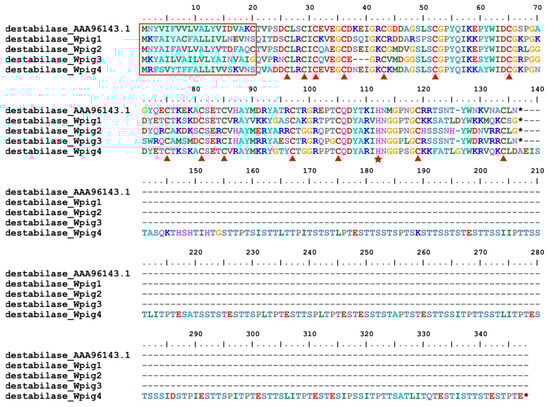 Sequence alignment of destabilases. Alignment of the archetypal destabilase from H. medicinalis and those found in the W. pigra genome. The red frame indicates a signal peptide region; the red triangles show conserved cysteine residues; the black stars mean stop codons; the red star shows the catalytic residue.