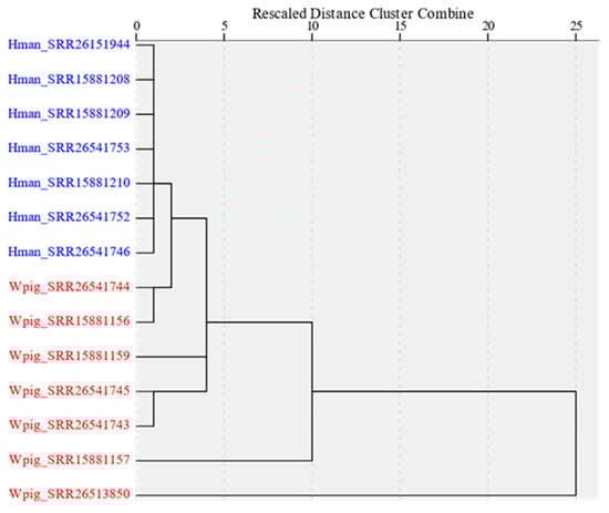 Hierarchical cluster analysis based on the expression of antithrombotic genes two leeches. Blue, seven samples from H. manillensis; red, seven samples from W. pigra.
