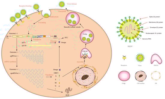 The replication of PEDV involves multiple significant stages, including attachment and entry, translation of viral replication enzymes, genome transcription and replication, translation of structural proteins, and virion assembly and release. The replication cycle of PEDV initiates with the recognition and interaction between the S protein and its receptor, followed by fusion with the plasma membrane [59]. Following viral entry, the genome of PEDV is released, initiating the immediate translation of the two major open reading frames (ORF1a and ORF1b) within the viral genome. This translation process produces the polyproteins pp1a and pp1ab, which are subsequently cleaved into 16 nsps, including the replication and transcription complex (RTC), and was utilized to participate in subgenomic mRNA (sg mRNA) transcription and the viral genomic RNA synthesis [60]. The S, E, and M proteins, translated by sgmRNA, are inserted into the endoplasmic reticulum (ER) and immobilized within the Golgi apparatus. At the same time, the N proteins interact with newly generated genomic RNA, resulting in the formation of ribonucleoprotein (RNP) complexes. Following that, viral particles comprising RNP are assembled within the ER-Golgi intermediate compartments (ERGIC) [56,61]. Finally, the infected cells undergo cytoplasmic exocytosis to release the viral particles (Figure 2).