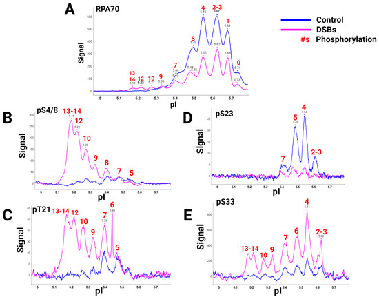 A global view of RPA heterotrimer phosphorylation was explained using a high-quality RPA70 antibody and isoelectric focusing (IEF) to separate RPA isoforms based on the number of phosphorylations present. Capillary IEF immunoassay data of the phosphorylated RPA heterotrimeric isoforms with and without DSB treatment, synchronized in the G2 phase of the cell cycle, were collected (Figure 2) [40]. In this study, data showed that RPA is always a phosphoprotein in the G2 phase by having up to seven phosphates (Figure 2A, blue line). Hyperphosphorylated isoforms generated after DSBs contained up to 13 or 14 phosphates. IEF identified some of these sites with phosphospecific antibodies (Figure 2B–E). The hyperphosphorylated forms with 13–14 phosphates included pS4/8, pT21, and pS33. Several of the sites had yet to be characterized before. DSBs showed increased phosphorylation by PIKK and CDK kinases in S and G2 phases, providing new information on candidate PIKK and CDK sites for future research.