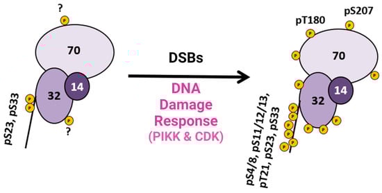 Summary diagram of RPA phosphorylation before and after DSBs. RPA is always phosphorylated (some sites are unknown and indicated with a ?), but after DDR is activated, RPA becomes hyperphosphorylated by the PIKK family of kinases and CDK cell cycle kinases, which phosphorylate RPA. Phosphorylation sites after DNA damage are shown in Figure 1D. Adapted from [40].