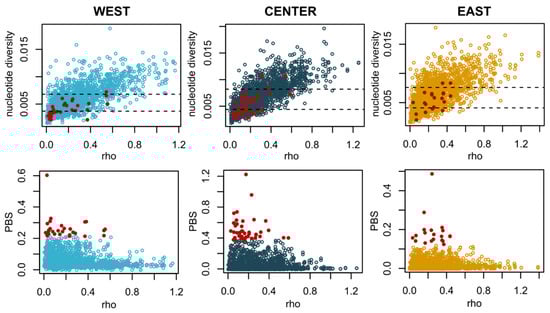 Summary statistics calculated across 50 kb windows located in putatively neutral regions of the genome located in comparison with the top outliers (99th percentile) of the PBS analysis for each region (red dots). Top: Nucleotide diversity vs. recombination rate. Bottom: PBS vs. recombination rate.