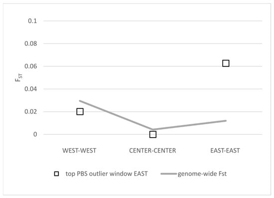Comparison of FST values for the top PBS outlier window putatively associated with otolith development within three geographical regions: WEST (Azores vs. Madeira), CENTER (Bay of Biscay vs. Gulf of Cádiz) and EAST (Adriatic vs. Aegean).