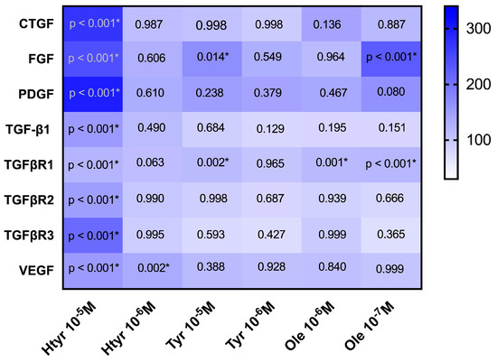 Heat map showing the percentage of gene expression of growth factors in human fibroblasts treated with different doses of htyr, tyr, and ole. The x-axis reflects the treatments used, while the y-axis reflects the genes studied. All values have been calculated, considering the control as 100%. * represents a p value < 0.05 from the ANOVA analysis.