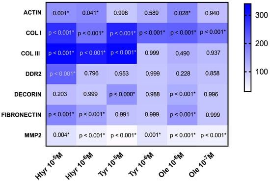 Heat map showing the percentage of gene expression of differentiation markers and extracellular matrix elements in human fibroblasts treated with different doses of htyr, tyr, and ole. The x-axis reflects the treatments used, while the y-axis reflects the genes studied. All values have been calculated, considering the control as 100%. * represents a p value < 0.05 from the ANOVA analysis.