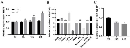 (A) The relative expression levels of HSF1 were assessed following the incubation of BMEC in a 42 °C incubator for 0, 6, 12, and 24 h (n = 9). (B) The expression level of miR-425-5p was determined in different tissues of cows (n = 9). (C) Changes in miR-425-5p expression levels were measured in BMEC after incubation for 0, 12, and 24 h at a temperature of 42 °C. The data are presented as means ± SEM. * p < 0.05, ns (no significance).
