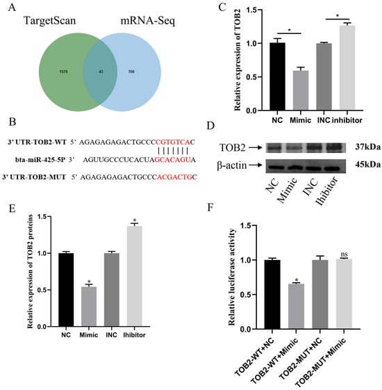 TOB2 was identified as a direct target of miR-425-5p. (A) The Venn diagram illustrates the overlap between predicted target genes of miR-425-5p according to TargetScan and downregulated genes identified through mRNA-seq analysis (padj < 0.05, log2foldchange < 0). (B) Sequence alignment of the binding site for the TOB2 gene with miR-425-5p targets. (C) The changes in TOB2 gene expression levels in BMEC were validated through RT-qPCR after the overexpression and suppression of miR-425-5p expression (n = 9). (D,E) Alterations in the expression levels of TOB2 protein were assessed following overexpression and inhibition of miR-425-5p, with β-actin serving as an internal reference (n = 3). (F) Luciferase reporter assay was conducted to investigate the binding of TOB2 gene with miR-425-5p target (n = 9). β-actin was used as an internal reference. The data are presented as means ± SEM. * p < 0.05, ns (no significance).