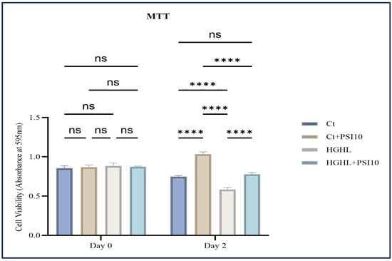 To examine the effects of psilocybin on β-cell loss caused by HG-HL conditions (400 μM PA + 25 mM glucose), an MTT assay was conducted, involving four treatment groups: Control (Ct), Control + Psilocybin 10 μM (Ct + PSI 10), HG-HL, and HG-HL + Psilocybin 10 μM (HG-HL + PSI10). The administration of 10 μM psilocybin to β-cells resulted in a significant improvement in cell survival under HG-HL conditions (Figure 1). Importantly, the initial cell viability was consistent across all wells of the 96-well plate, showing equal cell loading on day 0.
