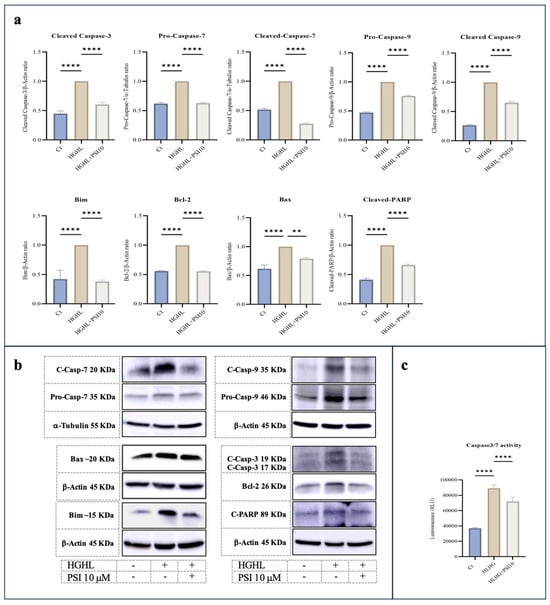 The immunoblot analysis of apoptotic biomarkers in HG-HL-challenged β-cells in response to psilocybin. (a) INS-1 cells were exposed to 10 μM psilocybin, followed by incubation with HG-HL for the next 48 h. Subsequently, the treated cells were used for protein extraction for Western blot analysis. The response of Pro-Caspase-9, C-Caspase-9, Pro-Caspase-7, C-Caspase-7, C-Capse-3, C-PARP, Bcl-2, Bim and Bax to 10 μM psilocybin in HG-HL-challenged β-cells, with normalization to housekeeping proteins. (b) Depicted are Western blot images of the apoptotic biomarkers. (c) Caspase 3/7 activity assay performed on β-cells challenged by HG-HL and treated with 10 μM psilocybin showed the mitigative impact of psilocybin on the elevated Caspase-3 and Caspase-7 activity in HG-HL-challenged β-cells. The results are depicted as the mean value with standard deviation, based on three measurements (N = 3). Abbreviations used are Ct (control), PSI (psilocybin), and HG-HL (high glucose + high lipid). Significance is denoted by asterisks, with two implying p < 0.01 and four indicating p < 0.0001.