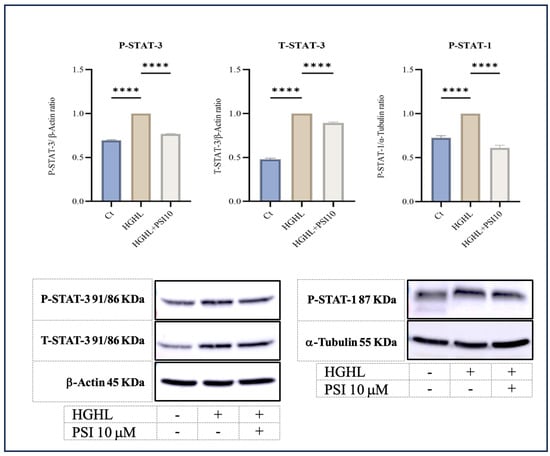 Under the HG-HL conditions employed in this study (48 h incubation with 400 μM PA + 25 mM glucose), P-STAT-3 and total STAT3 (T-STAT-3) levels increased, with mitigation observed after treatment with 10 μM psilocybin (Figure 3). These results suggest that the phosphorylation of STAT-3, in conjunction with STAT-1 phosphorylation, may serve as potential targets for psilocybin to exert its mitigative impact on the downregulation of apoptotic proteins.