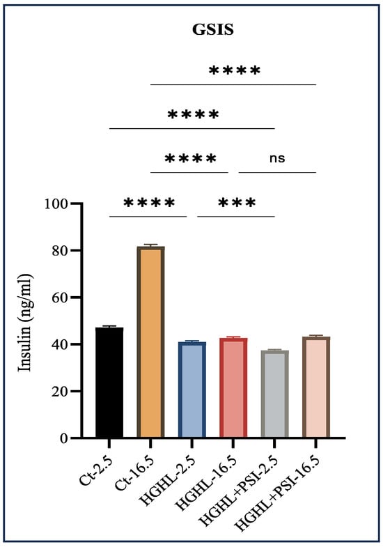 The impact of 10 μM psilocybin on GSIS of HG-HL-challenged β-cells. GSIS response of HG-HL-induced β-cell to psilocybin in media comprising 2.5 mM glucose and 16.5 mM glucose. Psilocybin did not exhibit any positive effects on the impaired GSIS in HG-HL-stimulated β-cells. The results are depicted as the mean value with standard deviation, based on three measurements (N = 3). Abbreviations used are Ct (control), PSI (psilocybin), and HG-HL (high glucose + high lipid). Significance is denoted by asterisks, with three implying p < 0.001 and four indicating p < 0.0001, while “ns” denotes non-significance.