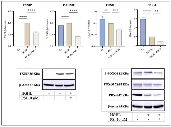 Thioredoxin interacting protein (TXNIP) is a key player in the apoptosis process. As a suppressive controller of thioredoxin, elevated expression of this factor has been linked to triggering apoptosis in diverse cell types [26]. The Western blot analysis of TXNIP in β-cells challenged by HG-HL conditions, following exposure to psilocybin, displayed a significant decrease in the induced levels of this protein (Figure 5).