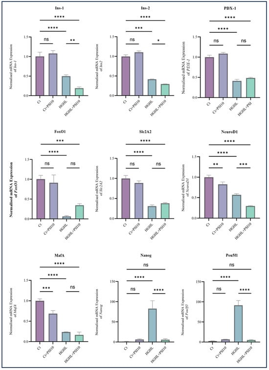 To investigate the impact of 10 μM psilocybin on β-cell dedifferentiation caused by HG-HL conditions (250 μM PA + 25 mM glucose for 24 h), we examined the expression of key biomarkers. The qRT-PCR analysis included four experimental treatments: Ct, Ct + PSI10, HG-HL, and HG-HL + PSI10. Under the HG-HL conditions, there was a reduction in the transcript levels of PDX-1, Ins1, Ins2, NEUROD1, Slc2A2, FOXO1, and MafA. Psilocybin did not restore the decreased transcript levels of these genes. HG-HL exposure significantly increased the expression of Nanog and Pou5f1 genes, while the addition of 10 μM psilocybin downregulated the mRNA levels of Nanog and Pou5f1 (Figure 6).