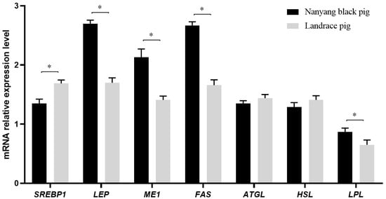 Expression levels of mRNAs involved in fat metabolism in subcutaneous fat tissue in Nanyang and Landrace pigs. The mRNA expressions of SREBP1, LEP, ME1, FAS, ATGL, HSL, and LPL in the subcutaneous fat tissue of Nanyang pigs and Landrace pigs were detected using qRT-PCR. The values with an asterisk (*) mean significant differences (p < 0.05). ATGL, adipose triglyceride lipase; FAS, fatty acid synthase; HSL, hormone-sensitive lipase; LEP, leptin; LPL, lipoprotein lipase; ME1, malic enzyme 1; SREBP1, sterol regulatory element-binding transcription factor 1.