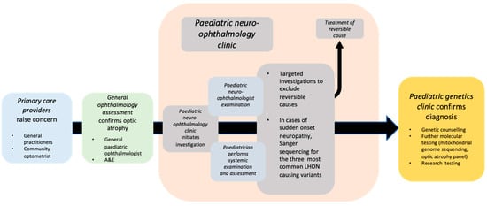 The pathway of patients from the point of concern being raised in primary care, through general ophthalmic services, the paediatric neuro-ophthalmology service and paediatric genetics clinics. A&E—accident and emergency clinic.