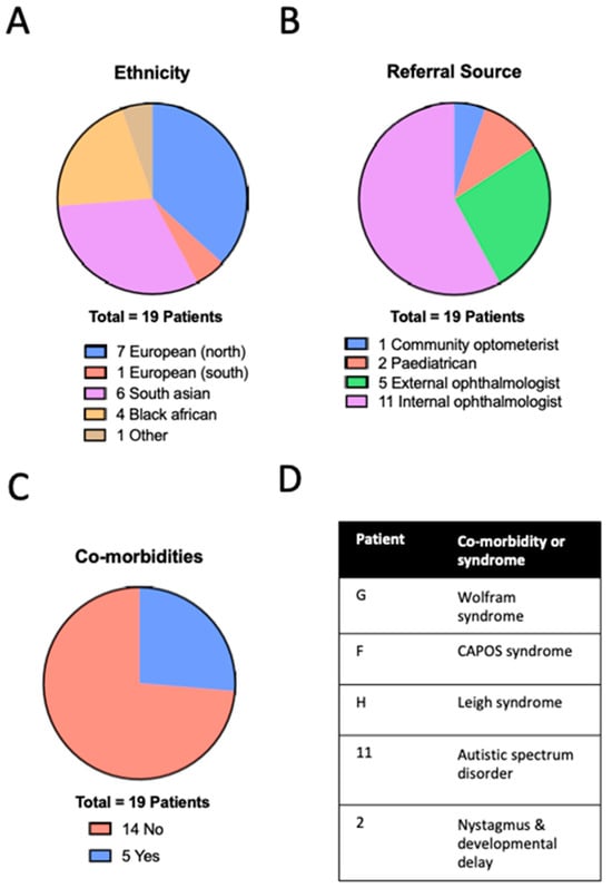 Characteristics of patients with inherited optic neuropathies. Breakdown of ethnicity (A), referral source (B) and presence of co-morbidity or syndromic diagnosis (C), further detailed in (D). CAPOS—cerebellar ataxia, areflexia, pes cavus, optic atrophy, sensorineural hearing loss. Patients with a confirmed molecular diagnosis have a letter identifier have a numeric identifier. Further information is given in Table S1.