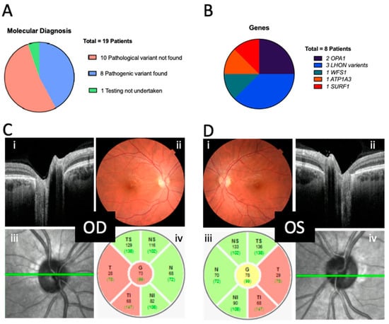 Molecular diagnoses. (A) Proportion of patients who underwent genetic testing and received a molecular diagnosis. (B) Identity of gene where pathological variant was found in those receiving a diagnosis. (C,D) Montage of images from patient B (OPA1c.1608+1G>A, Table 1) who presented with gradually progressive optic neuropathy from 14 years of age. Visual acuity at this time was R0.60/L0.70LogMAR with temporal disc pallor noted clinically, with ganglion cell dysfunction noted on electrophysiological investigation. MRI and other investigations for secondary causes were non-contributory and so genetic testing proceeded (Supplementary Table S1). (Ci,Dii) Optical coherence topography views of the disc in cross section and (Ciii,Div) en face. (Cii,Di) Colour fundus photos. (Civ,Diii) Peripapillary retina nerve fibre layer thicknesses; colour coding indicates comparison to normative database (Heidelberg, European)—green = within normal limits, red = below normal limits. Note temporal thinning in both eyes: N—nasal, I—inferior, T—temporal, S—superior. OD—Oculus dexter, right eye; OS—Oculus sinister, left eye.