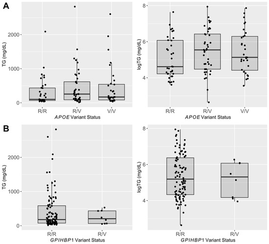 Range of triglyceride and log-transformed triglyceride concentration for the (A) APOE and (B) GPIHBP1 genotypes. R, reference allele; V, variant allele.