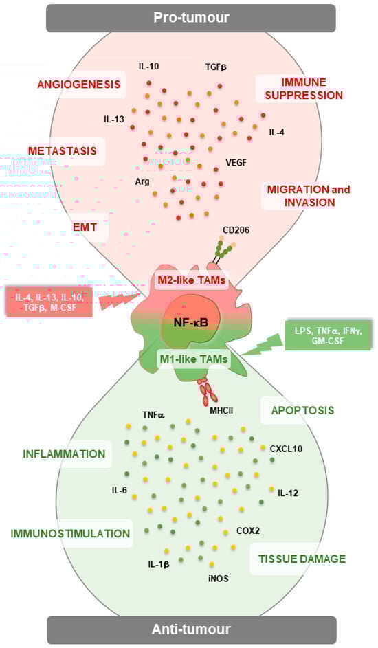 TAMs respond to the local signals provided by TME depending on tumor type and stage [26,27,28]. Although in the TME M2 macrophages are the most abundant population, M1 macrophages can be present in the TME during pathological conditions [29,30].