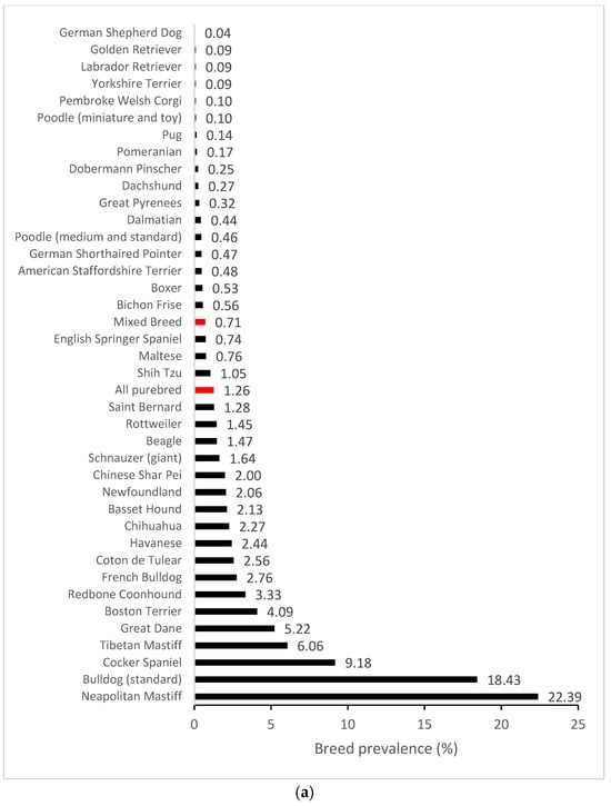We further compiled breed-specific cherry eye prevalence statistics and calculated ORs for mixed breed dogs and individual breeds, with at least 30 dogs represented in the EMRs and at least one case of cherry eye observed (n = 63) (Supplemental Table S1). The highest prevalence (>5%) of cherry eye was found in Neapolitan Mastiff (22.39%), Standard Bulldog (18.43%), Cocker Spaniel (9.18%), Tibetan Mastiff (6.06%) and Great Dane (5.22%) (Figure 1a). Breed-specific ORs were expressed using the odds in mixed-breed dogs as a reference. Several breeds were highlighted as having greater odds and others as having reduced odds of disease compared to the baseline (Figure 1b).