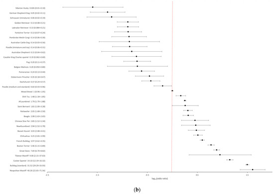 Breed-specific demographics of cherry eye in a US primary veterinary care cohort. (a) Breed prevalence in breeds with at least five cases observed and/or an observed prevalence > 2%; (b) Breed-specific odds ratios (black circles with 95% confidence interval error bars) for breeds with statistically significant deviations (p < 0.05) from the odds in mixed breed dogs. The baseline odds ratio in mixed breed dogs is depicted by the red vertical dotted line.