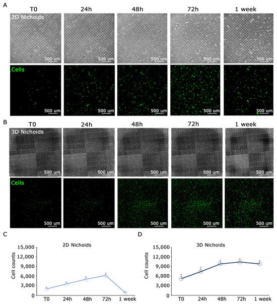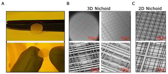 The construction of Nichoids (Moab Srl, Milano, Italy) involves a meticulous fabrication process utilizing two-photon polymerization (2PP). This advanced technique enables the polymerization of a photoresist onto a 12 mm cover glass, generating a three-dimensional lattice structure. The Nichoid architecture comprises a sequence of grids sustained by columns, creating well-defined graded micrometer-scale pores. It consists of 218 square blocks; each block encompasses 5 × 5 structures. These individual units, measuring 90 × 90 × 30 μm3, are composed of a multi-tiered arrangement of interconnected rods. In this work, we compared two different geometries, 2D and 3D Nichoids. Two-dimensional Nichoids are flat structures with a grid; 3D Nichoids have vertical walls and are multitiered. Details of fabrication are reported in [16].