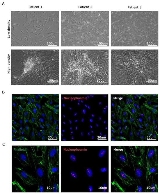 Three MPM cell lines established by isolating cells from biopsies belonging to different patients. (A). Images of three different mesothelioma-derived cell lines cultured at low density (top) and high density (bottom). (B). Immunofluorescence analysis of derived cells stained with Phalloidin for cytoplasmic microfilaments (green signal), nucleophosmin for nucleolar structure (red signal), and DAPI for nuclei (blue signal). (C) High magnification of (B). Scale bars are shown.