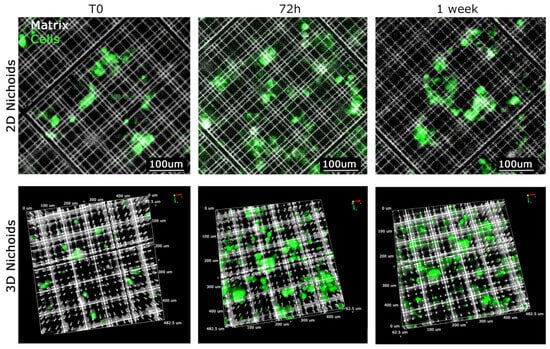 Growth of cells in XYZ dimension in 2D and 3D Nichoid. Visualization of representative primary MPM cells grown in 2D Nichoid (top) and 3D Nichoid (bottom) at defined time points. The 2D structure is represented by only 1 plan and 3D structure by Z-stack spanning 30 um in thickness. MPM cells stained with CFSE are visualized in green, whereas the Nichoid grids, fluorescence emitting upon violet light excitation (385 nm), are displayed in white. Scale bars and 3D orientation as displayed.