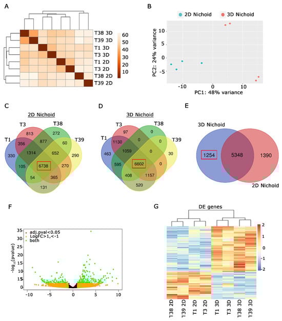 Transcriptional analysis of MPM cells cultured in 2D and 3D Nichoids highlights distinct transcriptional signatures on the three-dimensional culture. (A). Distance matrix analysis evidenced the presence of specific clusters among 2D and 3D Nichoids. (B). PCA analysis showed that 3D Nichoids are more similar than 2D Nichoids. (C) Venn diagram of protein coding genes expressed by 4 primary MPM cells grown in 2D Nichoids. Number of common genes in all possible conditions are indicated. Common genes among all the cell lines are bolded in a red box. (D) Venn diagram of protein coding genes expressed by indicated MPM cells cultured in 3D Nichoids. Number of common genes in all possible conditions are indicated. Common genes among all the cells are bolded in a red box. (E) Venn diagram obtained by comparing common genes of all indicated cell lines in C and D. Number of protein coding genes specifically expressed in 3D Nichoids is highlighted in the red box. (F). Volcano plot evidencing significative deregulated genes among 2D and 3D Nichoids, highlighted in green. Criteria for selection are evidenced: green for |log2(FoldChange)| > 1 and adjusted p value ≤ 0.05; orange for log2(FoldChange) <−1 e > 1; red for adjusted p value ≤ 0.05. (G). Heatmap of significative DE genes among 3D Nichoids vs. 2D Nichoids. Each row represents a gene, while columns depict different samples. The color gradient represents gene expression levels, with red indicating upregulated genes and blue representing downregulated genes in 3D Nichoids compared to 2D Nichoids. Higher color intensity reflects higher expression levels. The analysis highlights distinct transcriptional signatures providing insights into gene expression alterations in response to three-dimensional culture conditions. All analyses were performed in biological replicates using four distinct samples.