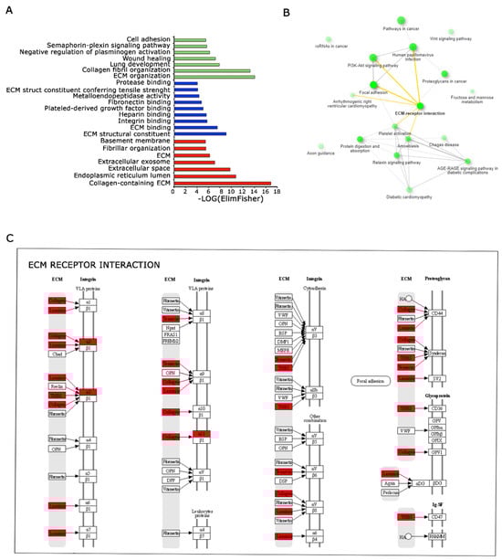 Functional analysis of DE genes among 3D and 2D Nichoids depict the perturbation of the ECM pathway. (A). Representation of enriched biological processes (represented in green), molecular functions (represented in blue) and cellular components (represented in red)identified through Gene Ontology analysis. Significantly enriched terms are highlighted, indicating biological pathways implicated in the studied conditions. (B). Pathway relationships depicted based on gene enrichment analysis. Interconnected pathways share common genes, emphasizing the interplay and connectivity among molecular pathways influencing cellular responses in the investigated system. ECM interaction is evidenced in bold and links in yellow. (C). Pathview representation displaying the ECM interactions enriched with deregulated genes between 3D and 2D Nichoids. Genes highlighted in red represent the upregulated genes in our dataset, emphasizing their involvement in the ECM pathways and cellular interactions.