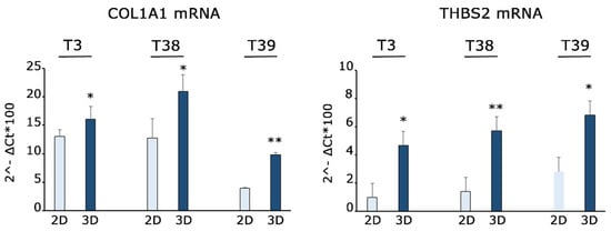 Gene expression quantification shows upregulation of COL1A1 and THBS2 in 3D Nichoids. RT-qPCR for COL1A1 and THBS2 mRNAs performed on three independent primary MPM cells grown in 2D and 3D Nichoids for 4 days. Histograms represent the means ± the SD of three independent experiments. Statistical p values were calculated using double-tailed unpaired t test. * = p < 0.05, ** = p < 0.01.