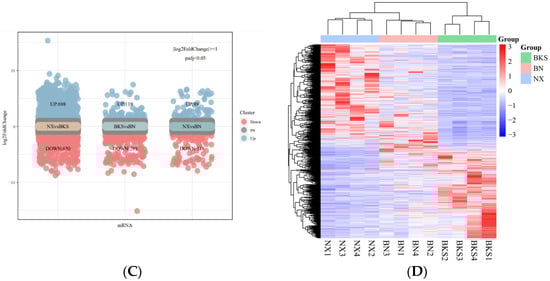 According to the data, there was a total of 14,586 genes in all pig groups. At the same time, we analyzed that the common genes were 12,015. To explore DEGs between groups, we conducted differential gene expression analysis. Figure 1A shows the distribution of gene expression levels across the samples depicted by a boxplot. Comparing Ningxiang and Berkshire pigs, 1348 DEGs were identified, of which 698 were upregulated and 650 were downregulated. The comparison between Ningxiang pigs and F1 offspring revealed 207 DEGs. Of these, 89 genes were upregulated and 118 genes were downregulated. Additionally, when comparing Berkshire pigs and F1 offspring, there were 417 DEGs, including 119 upregulated genes and 298 downregulated genes (Figure 1C). Figure 1D shows a clustering heatmap that displays the expression patterns between groups.