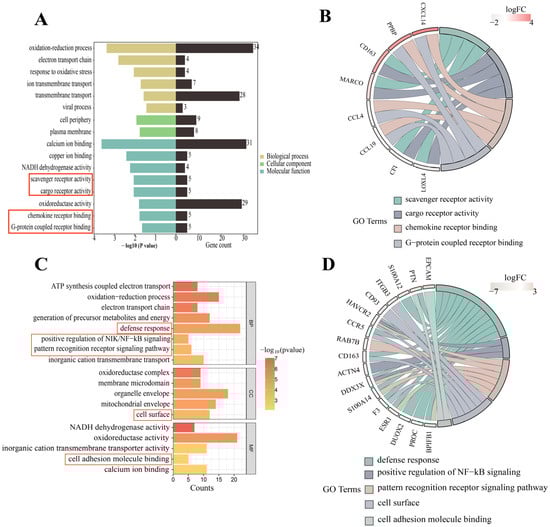 Gene ontology (GO) term analysis showed that there were 36 statistically significant terms for Ningxiang pigs compared with Berkshires. The significantly upregulated terms were mainly involved in G-protein coupled receptor binding, scavenger receptor activity, cargo receptor activity, ion transmembrane transport, and chemokine receptor binding. The significantly downregulated terms in Ningxiang pigs were mainly related to the regulation of multicellular organismal processes and response to oxidative stress (Figure 2A). Notably, the GO annotations of G protein-coupled receptor binding, cargo receptor activity, chemokine receptor binding, and scavenger receptor activity are primarily connected to immune responses and immune reactions. Gene annotation revealed that genes such as CD163 (cluster of differentiation 163) were related to these two molecular function (MF) terms (Figure 2B).
