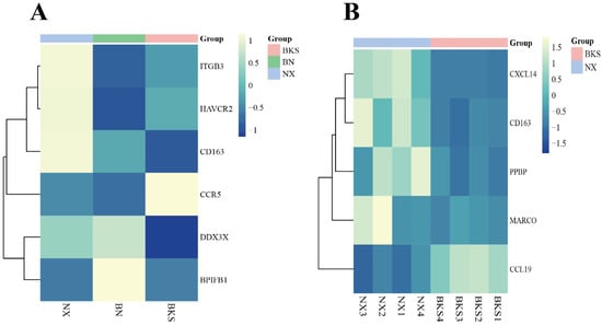 Regarding the immune terms and pathways in this study, we screened for several immune DEGs. In comparison to Berkshires, the CXCL14, CD163, PPBP, and MARCO genes were upregulated in Ningxiang pigs, and CCL19 was downregulated in Ningxiang pigs (Figure 3A). Compared with the parents, the DDX3X and BPIFB1 genes were upregulated in F1 offspring, and ITGB3, HAVCR2, and CCR5 were downregulated in F1 offspring. The expression level of CD163 was intermediate between Ningxiang and Berkshire pigs (Figure 3B).