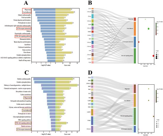 When comparing Ningxiang pigs with Berkshires, the PPI network analysis identified EGFR and ITGA2 as hub genes (Figure 5). EGFR is involved in the PI3K–Akt signaling pathway, EGFR tyrosine kinase inhibitor resistance, and focal adhesion. ITGA2 is involved in the phagosome, the PI3K–Akt signaling pathway, focal adhesion, and ECM–receptor interaction, which are all enriched in the comparison of Ningxiang pigs vs. Berkshires (Figure 6).